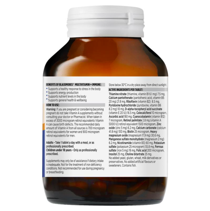 Blackmores Multivitamin + Immune is a comprehensive multivitamin to support immune system health, containing a combination of vitamin C and essential nutrients.