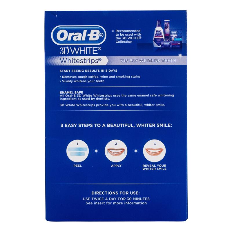 Oral-B® 3D White® Whitestrips® visibly whitens teeth. Start seeing results in 5 days. It:- Removes tough coffee, wine and smoking stains