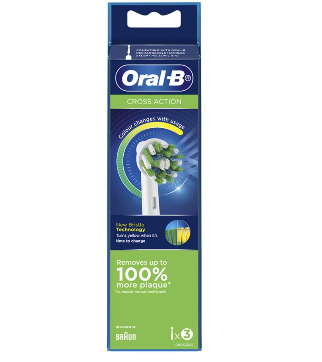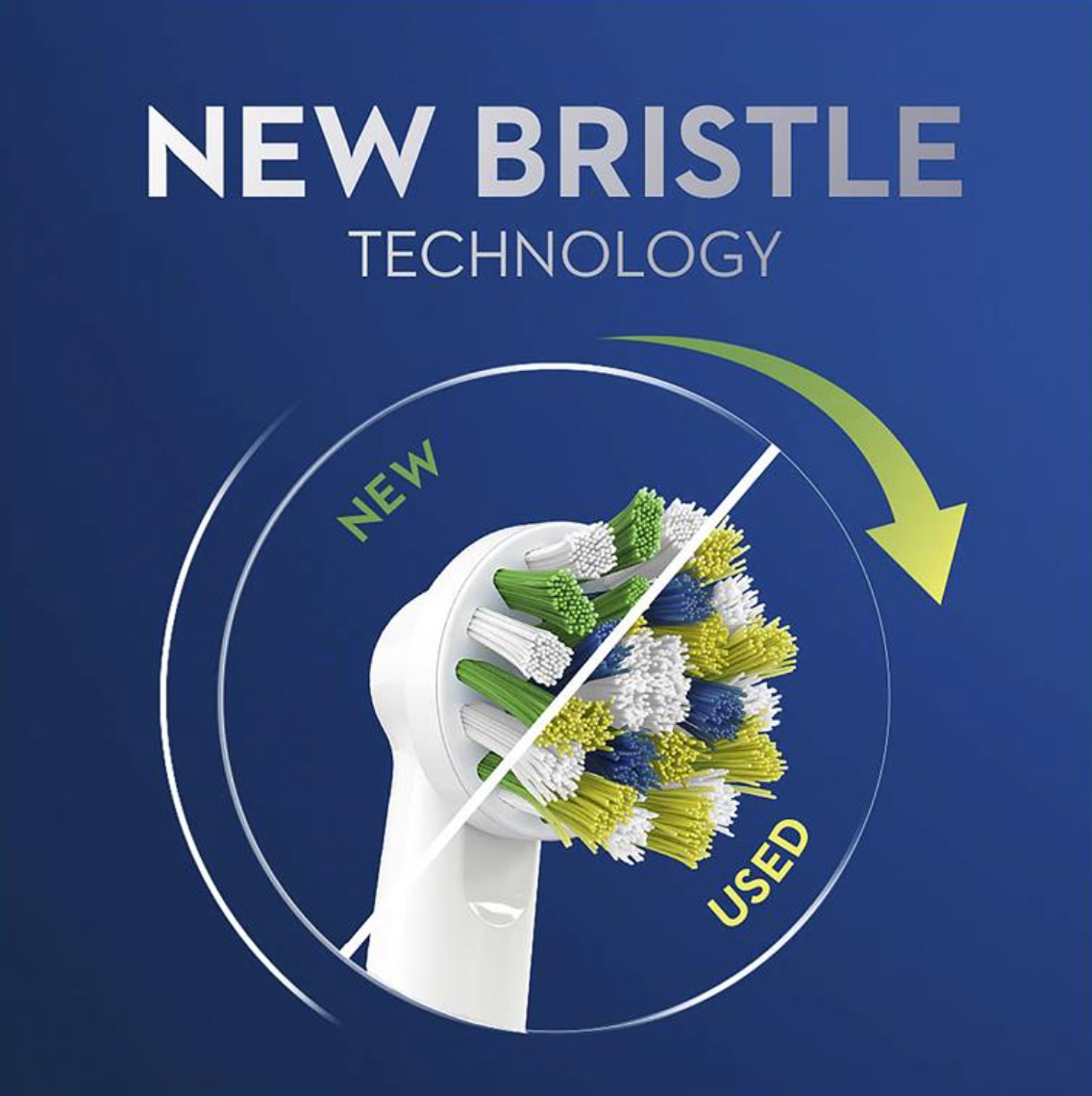 New Bristle Technology: Oral-B Cross Action brush head turns from green to yellow, indicating when it is time to change. Features precise angles that target plaque to remove up to 100% more plaque vs. a regular manual toothbrush. The shape of the brush head is designed for optimal tooth coverage. Bristles reach deep between teeth to remove plaque and leave your whole mouth cleaner than a regular manual toothbrush