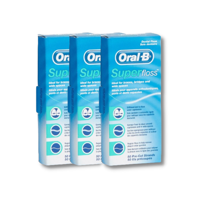 Oral-B Super Floss is ideal for cleaning braces, bridges and wide gaps between teeth. Its three unique components—a stiffened-end dental floss threader, spongy floss and regular floss—all work together for maximum benefits.