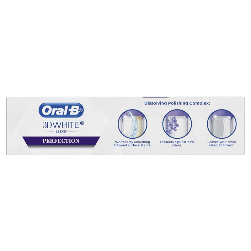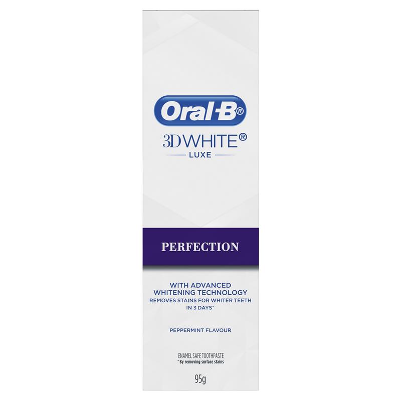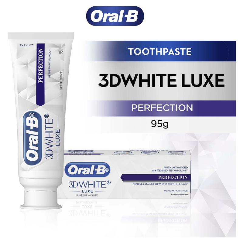 Oral-B 3DWhite Luxe Perfection Toothpaste is our most advanced whitening technology* that removes stains for whiter teeth in 3 days^. *vs Oral-B 3DWhite toothpastes. ^by removing surface stains
